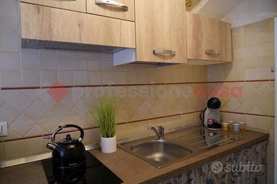 Al piano d'ingresso troviamo una zona living con cucina a vista e area relax; sullo stesso livello è presente un bagno completo di doccia, wc, bidet e lavatrice.