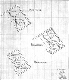 La casa è distribuita su tre livelli , cantina divisa in in tre locali , al piano rialzato tre camere un soggiorno con cucinino e un ripostiglio dal quale si accede all'ampio sottotetto.