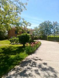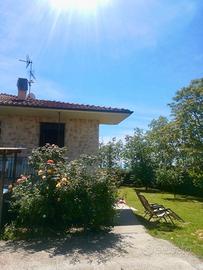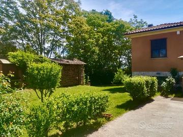 Per veri amanti della natura e della privacy immersa nel verde casa totalmente indipendente di 200 mq di cui mq 100 abitativi al P. T. e mq 100 al P seminterrato. Si accede all'abitazione tramite una strada sterrata in ordine e con una semplice auto. L'abitazione è composta da ingresso, grande cucina, sala, 2 camere e bagno mentre il seminterrato è composto da cantina, locale deposito e locale lavanderia. La proprietà comprende un giardino di 1800 mq totalmente recintato con rete e alte siepi, accesso carraio con cancello elettrico, posti auto. All'interno della proprietà sono presenti locali deposito/legnaie e un box di mq 50. Riscaldamento sia con bombolone interrato sia con termo stufa a legna collegata ai termosifoni. Fossa biologica. Il giardino dispone di una piccola piscina semi interrata da sistemare parzialmente. Parzialmente arredato. La casa viene venduta con tutte le pratiche comunali e catastali in regola. No agenzie.