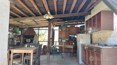 Sul cortile antistante la casa si affaccia un basso fabbricato con tettoia adiacente che consente il ricovero di tre autovetture. Alle spalle del basso fabbricato è presente un patio che si affaccia sull'ampio giardino privato ideale per trascorrere all'aperto le fresche serate estive.