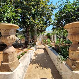 A Presicce Acquarica, precisamente in località Presicce, a pochi passi dal Palazzo Comunale e dal Centro Storico di uno dei Borghi più Belli d'Italia, proponiamo bellissima Dimora storica con ampio giardino. E' stata edificata nel 1880 su progetto dell'Arch. Carlo Luigi Arditi. L'immobile sorge su un lotto di quasi mille metri quadri, prospiciente su tre strade, ed ha una superficie coperta di 500 metri quadri distribuiti su 2 livelli. La parte abitativa si sviluppa al piano rialzato e si compone di 10 vani con copertura a volta del tipo 'Padiglione'. Da Corso Roma si accede ad un ampio vano d'ingresso centrale, utilizzato sia come soggiorno che come accesso agli altri locali, quali il tinello, cucina abitabile con camino, studio, tre camere da letto, salottino con volta pregevolmente affrescata ed angolo pianoforte, e due bagni. Contigui, ma non comunicanti con il corpo di fabbrica precedentemente descritto, due vani con copertura a stella e bagno. Tali vani possono essere messi in comunicazione con l'abitazione principale, oppure utilizzati come piccola unità abitativa o studio professionale a sè stante, avendo ingresso indipendente da Corso Roma e Via Zara. Dalla sala da pranzo della dimora si accede direttamente su un loggiato che guarda lo splendido giardino retrostante, che ha una superficie di 625 metri quadri, diviso in quattro grandi aiuole con dei vialetti contornati da colonne, che a loro volta sostengono un pergolato. I vialetti si congiungono in un grande spiazzo circolare, nello stile delle dimore storiche salentine. Un'apertura posta nella parte inferiore del loggiato conduce nell'ampia cantina di 200 metri quadri, con volte 'a stella' poggianti su colonne senza partizioni murarie, formanti un unico ambiente dotato anche di un'antica cisterna. Completano la proprietà due ampi garages, aventi accesso da Via Zara.