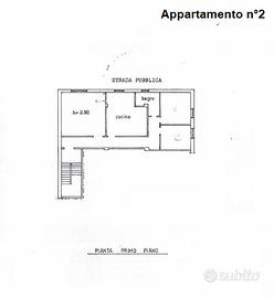 2° Appartamento: ingresso su disimpegno, ampia cucina abitabile con salone e camino, due camere da letto e bagno con vasca.