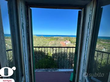 Il primo piano (attualmente con accesso da scala esterna) è composto da tre vani, un ulteriore servizio, un cucinino, un disimpegno e un balcone panoramico dal quale è possibile ammirare una splendida vista sul mare.