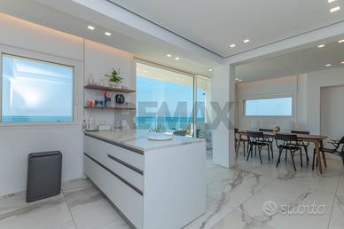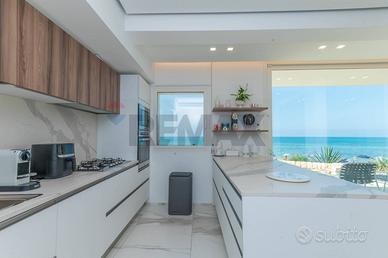 Accedendo alla proprietà, sarete accolti da una spaziosa e luminosa zona living, perfetta per momenti di relax e convivialità. La cucina con penisola, completamente attrezzata, si apre sul soggiorno, dove le ampie vetrate offrono una vista ininterrotta sulla veranda e sulla spiaggia. Sempre al piano terra, si trovano un bagno moderno e due comodi ripostigli.