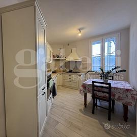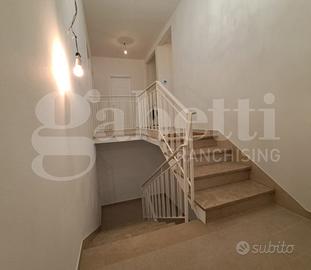 Al piano terra il portoncino si apre sul disimpegno con una comoda scala che ci accompagna al primo piano dove si sviluppa l' intero appartamento composto da ampio e luminoso salone con illuminazione a faretti, cucina abitabile con ripostiglio, camera matrimoniale, bagno finestrato con doppio lavabo e doppio box doccia, piccolo angolo lavanderia, camera media , e studio/ camerina con scala retrattile che dà accesso al sottotetto a uso ripostiglio.
