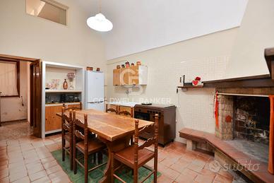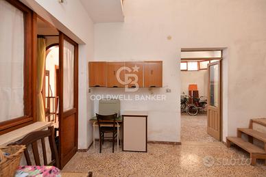 All'entrata ci accoglie un comodo ingresso dal quale si raggiungono l'ampio salone, con finestra che affaccia sulla suggestiva stradina del centro storico, e la cucina con un tipico camino. Dalla cucina, tramite un piccolo disimpegno, si raggiunge il bagno.