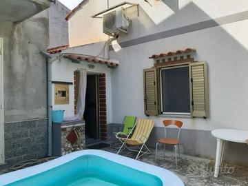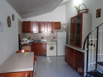 Vendo bellissima e panoramica casa indipendente su due piani, completamente ristrutturata. di 80 mq calpestabili con annesso posto auto e terreno di 680 mq. Piano terra: cucina abitabile, camera e bagno, balconcino con ringhiera; primo piano: camera, bagno e balconcino. L'abitazione è dotata di condizionatori. Terreno è recintato, ad uso agricolo(ulivi)con magazzino di circa 15 mq.