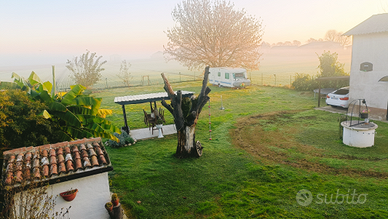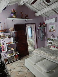 77 mq disposti su due livelli: al piano terra ingresso su ampia e luminosa zona living, sala pranzo e cucina in muratura. Al piano primo, bagno con doccia, camera matrimoniale e ampio vano ora adibito a stanza per ragazzi. Porta di ingresso e infissi in PVC simil legno e doppio vetro. Zanzariere presenti su tutte le finestre. Inferiate al piano terra, compresa la porta di ingresso. Riscaldamento autonomo mediante stufa a pellet Idro e/o con comune gas metano tramite caldaia Immergas. Al piano superiore è presente impianto di aria condizionata doppio split con pompa di calore. Installato impianto di areazione forzata per minimizzare umidità e muffe. Di pertinenza un giardino esclusivamente privato e completamente recintato. Annesso terreno ad uso agricolo per un totale di 606mq. Cancello automatico e cancello pedonale. Nella corte è presente un altro edificio ad uso di magazzino. Posto auto al coperto. Pozzo con acqua per irrigazione giardino. Intonaco esterno rifatto l'anno scorso. L'immobile si cede quasi tutto arredato. Si cede anche robot tosaerba automatico Stiga per il mantenimento dell'area verde senza stress. Giardino con piantumazione presente ( siepi e alberi). Certificazione APE e RTI in corso.