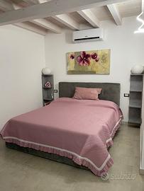 Primo piano una camera matrimoniale con balcone e bagno con doccia,