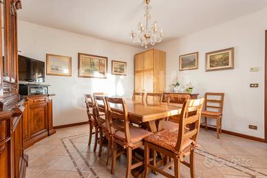 L'atrio d'ingresso suddivide gli ambienti del piano terra, separando la cucina abitabile da un lato e i restanti vani dall'altro. Qui troviamo un soggiorno indipendente, accogliente e ideale per la vita quotidiana, una piccola taverna con caratteristico camino in muratura che crea un'atmosfera intima perfetta per momenti conviviali in famiglia o con amici, oltre a una pratica cantinetta e a un bagno dotato di box doccia.