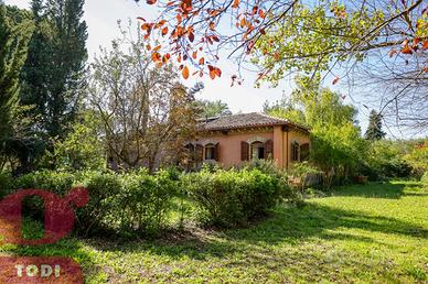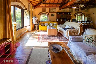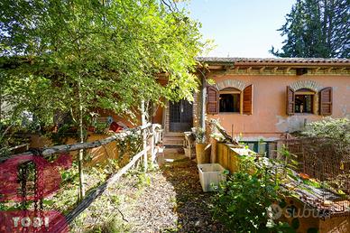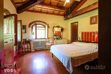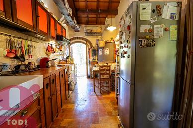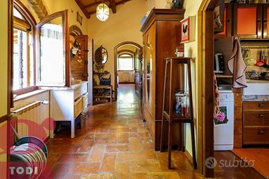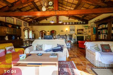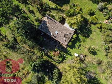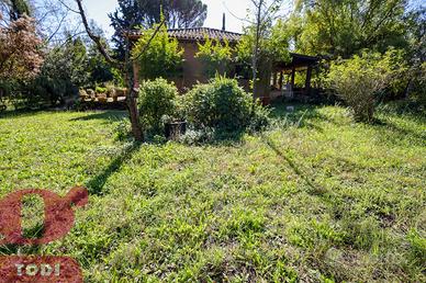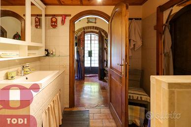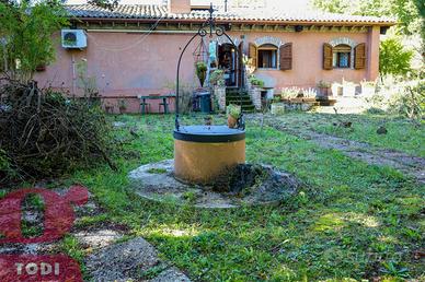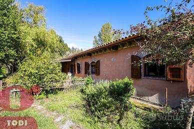 CASALE immerso nel verde in località Selvarelle, frazione collinare al confine fra il Comune di Todi e quello di Acquasparta. In posizione tranquilla ma non isolata, questo immobile, disposto su due livelli, è una soluzione ideale sia come prima abitazione che come seconda casa in campagna. Al piano terra rialzato troviamo la zona abitativa, dotata di doppio ingresso. Questa vanta di ingresso, salone doppio di 70mq, inondato di luce grazie alle ampie vetrate ad arco sapientemente posizionate e con termocamino ad angolo, cucina, anch'essa con camino, due camere matrimoniali comunicanti e due bagni, di cui uno soppalcato per ricavare ancor più spazio. L'accesso al giardino è possibile sia tramite la cucina che attraverso l'ingresso, garantendo indipendenza nell'uso degli spazi. Al piano seminterrato si trova invece la cantina-magazzino, sfruttabile come garage e come rimessa per gli attrezzi. La proprietà presenta internamente tutti i caratteri tipici dell'architettura umbra. Troviamo il pavimento in cotto, delle magnifiche ed imponenti capriate, le travi in legno e le pianelle che conferiscono alla casa quell'atmosfera calda ed accogliente che la rende piacevolmente vivibile in ogni suo locale. Completano la proprietà anche un portico (18 mq) adiacente all'ingresso, un bellissimo giardino e terreno agricolo per un totale di quasi 1,7 ettari, a circondare tutta la casa. Qui sono presenti 100 ulivi, 100 alberi da frutto, 2 filari di vigna ed ancora grandi tigli, abeti e pini. La cura del giardino, in cui è già predisposto l'impianto di illuminazione, è consentita grazie al pozzo e due raccoglitori di acqua piovana, con diversi punti studiati per l'erogazione dell'acqua. Sono inoltre presenti pannelli termo-elettrici. La proprietà è recintata su tre lati, mentre sul retro la privacy è garantita dal dirupo. Possibilità di aggiungere altri 100 mq di abitazione. Ottima anche la posizione, a circa 2km dal paese dove si possono trovare i beni di prima necessit