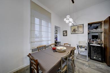 Un ampio e luminoso soggiorno con cucina Lube (modello Oltre) a vista in open space, progettato per ottimizzare gli spazi e offrire un ambiente pratico e funzionale. È presente in questo piano un primo servizio igienico finestrato con box doccia.