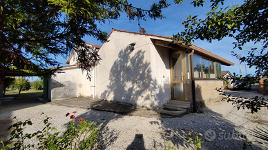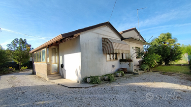 Interessante casa indipendente, su un piano, in zona tranquilla, lontano dalle vie di passaggio. Composta da quattro ampi vani principali (una cucina e un salotto separati e due camere matrimoniali) più un bagno e tre comode zone di disimpegno, per un totale di 108 metri quadri interni circa. È dotata anche di una veranda e un terrazzino esterno eventualmente sfruttabile. Sono presenti inoltre, ambienti di servizio esterni ed è circondata da cortile/giardini e terreno edificabile, per un totale di 1157 metri quadri circa. È la soluzione ideale per chi cerca un contesto appartato e tranquillo e un ampio spazio verde facilmente personalizzabile.