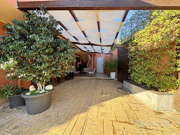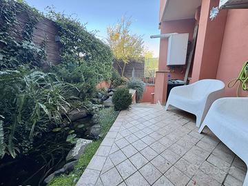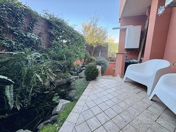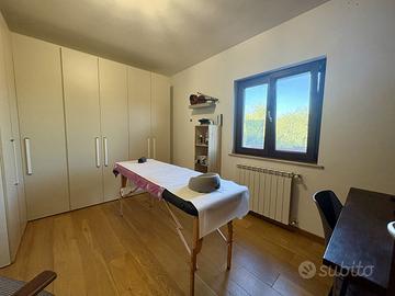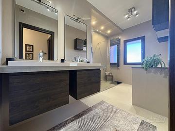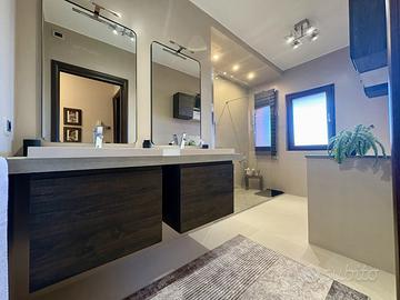 Al primo piano troviamo la camera matrimoniale principale con cabina armadio e uscita su una veranda, una seconda camera matrimoniale con accesso diretto alla corte esterna, impreziosita da un laghetto ornamentale, e una terza camera singola, ampia e luminosa. Il bagno padronale è un vero gioiello, rifinito con materiali di pregio come resine e cemento autolivellante, dotato di piatto doccia marmorizzato walk-in con vetro temperato.