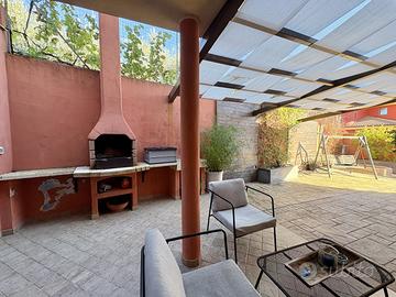 All'esterno, la proprietà vanta un ampio giardino con zona barbecue, perfetto per cene all'aperto e momenti di relax, oltre alla possibilità di posteggio auto interno.