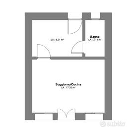 Piano terra: cucina-soggiorno con caminetto, antibagno-corridoio e bagno finestrato. Porta di servizio sul retro.
