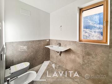 Al piano terra un Open Living Space da 40mq con accesso su entrambi i lati ai due giardini, salendo la scala si arriva al piano superiore dove trovano posto una camera matrimoniale con accesso diretto alla loggia panoramica, una seconda ampia camera con accesso ad un'altra loggia riservata ed un ampio bagno finestrato;
