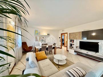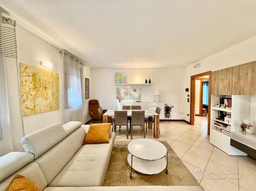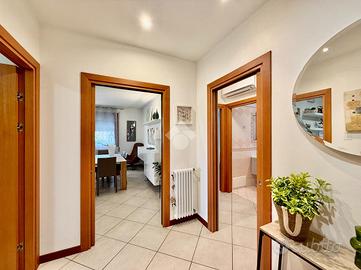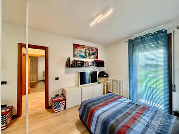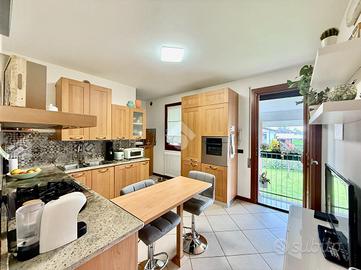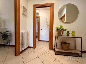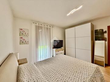 Ingresso attrezzato con specchiera e console, cucina abitabile separata e con dispensa, soggiorno con sala da pranzo affacciato sulla loggia e sul giardino, due camere da letto e bagno finestrato con doccia multifunzione.