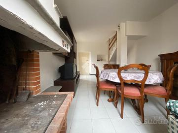 Salendo al primo piano tramite scala, troviamo il secondo ingresso e un soggiorno con camino.
