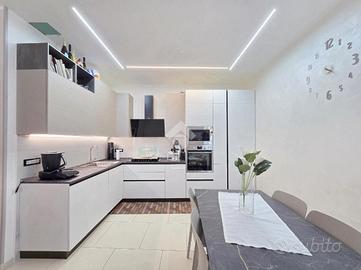 Attraverso la porta blindata veniamo accolti dall'ampio soggiorno living con la cucina angolare a vista. Sicuramente valorizzata dall'illuminazione a led annegata nella controsoffittatura, la zona giorno si presenta ampia e particolarmente funzionale grazie alle lunghe pareti lineari che ospita al suo interno. La zona più lontana è composta dalle due pareti attrezzate ed ospita comodamente tavolo e sedie. Quella più vicina all'ingresso è adibita a soggiorno. All'interno del living, è stato già predisposto l'impianto che permette l'inserimento della stufa a pellet compreso di canna fumaria, collegata all'impianto di riscaldamento. Attualmente il riscaldamento autonomo e l'acqua calda sanitaria sono gestiti dalla caldaia a metano ubicata nel balcone che costeggia la proprietà. Attraverso la porta in cristallo è raggiungibile il corridoio che porta ad ogni locale della zona notte, compreso i doppi servizi. La prima camera matrimoniale possiede una conformazione molto lineare, tanto da ospitare ogni tipologia di mobilio. Adiacente ad essa è posizionato il primo bagno finestrato. Al suo interno, oltre ai sanitari e la vaschetta incassata, trova spazio anche la particolare doccia angolare in cristallo. Accanto al primo bagno è posizionata la seconda camera, anch'essa matrimoniale che ospita 3 punti luce al suo interno, raggiungibile percorrendo il corridoio fino al fondo. Nella stessa zona, attraverso una porta riservata adesso, è utilizzabile il comodo ed ampio ripostiglio. Attualmente utilizzato come tale, il grande ripostiglio potrebbe essere adibito anche a lavanderia poiché è posizionato in aderenza al secondo bagno. Quest'ultimo oltre a sanitari e lavandino, ospita anche gli impianti della lavatrice. Tutta la pavimentazione dell'appartamento è omogenea in ogni locale e, la completa ristrutturazione ha visto anche la sostituzione degli infissi esterni e delle porte interne. Impianti elettrici ed idraulici sono già stati rifatti e, l'immobile si presenta subito abi...