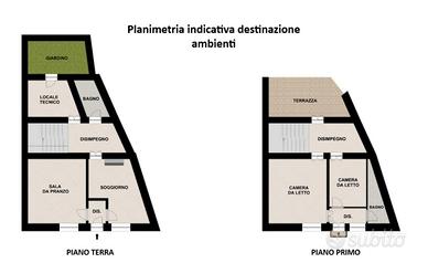 * Piano terra: ampio soggiorno con camino, sala da pranzo, bagno, locale tecnico e accesso diretto al giardino privato.
