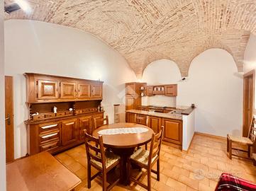 Al piano primo, la proprietà si distingue per la presenza di due appartamenti, ciascuno con ingresso autonomo. Il primo è stato ristrutturato e si compone di ingresso, soggiorno con angolo cottura e camino caratterizzato da un bellissimo soffitto con volte in pietra, camera matrimoniale, camera singola, bagno finestrato con vasca e lavanderia. Il secondo appartamento, da ristrutturare, conserva pavimentazione originale ed è composto da zona giorno, camera ed altro vano finestrato con possibilità di realizzare il bagno. Al piano terra, si trovano fondi al grezzo caratterizzati da affascinanti volte in pietra, che offrono la possibilità di realizzare una terza unità abitativa.