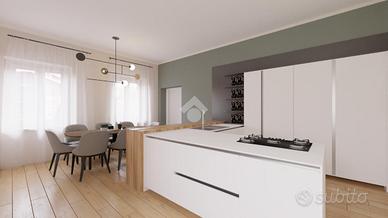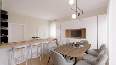 Al piano terra si sviluppa la zona giorno, caratterizzata da un ingresso living sul soggiorno con angolo cottura a vista e una seconda stanza da adibire a sala da pranzo o tavernetta, a seconda delle esigenze. Primo bagno finestrato con doccia.