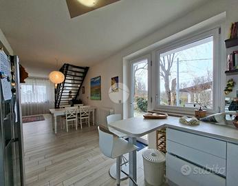 L'ingresso si apre su uno splendido soggiorno con camino a vista, un ambiente caldo ed accogliente che rappresenta il cuore della proprietà; la cucina è abitabile ed è direttamente collegata alla zona living.