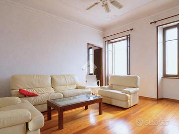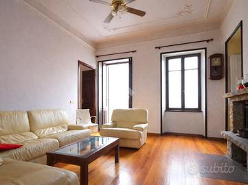 Salendo al primo piano si accede all'appartamento principale, caratterizzato da grande fascino e dettagli d'epoca. L'ingresso avviene attraverso una porta in legno e vetro che conduce a una splendida stanza impreziosita da grandi vetrate colorate in stile antico, elemento di forte impatto scenografico. Da questo ambiente è possibile accedere al terrazzo dell'alloggio, raggiungibile anche da una delle camere da letto. L'abitazione dispone inoltre di un ampio soggiorno con camino a vista e accesso al balcone, di una camera matrimoniale di generose dimensioni con soffitti affrescati, di un'ulteriore stanza collegata al terrazzo, di una cucina spaziosa con accesso a un piccolo locale adibito a dispensa e di un bagno con doccia. Gli infissi originali con doppio vetro contribuiscono a mantenere il carattere storico dell'immobile garantendo al contempo comfort. Al piano superiore è presente un secondo appartamento con disposizione e caratteristiche simili a quelle dell'alloggio sottostante, ma non ancora ristrutturato. Questa unità rappresenta un'interessante opportunità per ampliare la parte abitativa o per creare un'ulteriore soluzione da mettere a reddi..