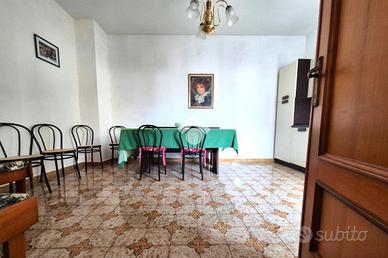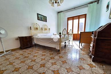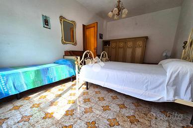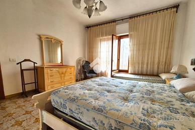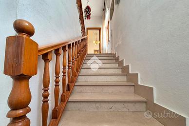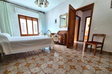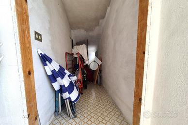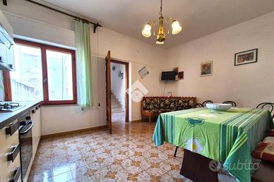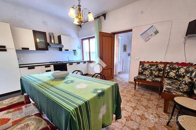 Una volta superato il portoncino d'ingresso, troviamo la comoda scala che ci conduce al primo e principale piano della casa. Frontalmente troviamo la zona giorno composta da sala da pranzo con angolo cottura, molto luminosa grazie alla grande finestra. Dallo spazioso disimpegno accediamo alla zona notte, composta da due camere da letto matrimoniali e un bagno padronale con vasca da bagno. Entrambe le camere da letto affacciano, tramite porta finestra, al balcone su strada da cui godiamo di un primo scorcio sul lungomare situato in fondo alla via.