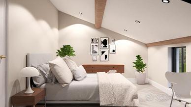 Dalla cucina, una comoda scala conduce alla zona notte, che include due camere da letto: una matrimoniale, con cabina armadio, e una singola. La camera padronale, spaziosa e confortevole.