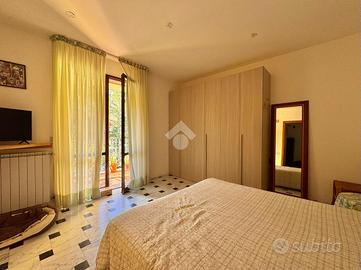 Attraverso pochi scalini si raggiunge la zona notte, composta da camera matrimoniale con balcone, camera singola e bagno con doccia.