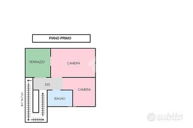 piano primo: una camera matrimoniale particolarmenteluminosa con affaccio sul terrazzo, una camera singola finestrata e un bagno con vasca finestrato.