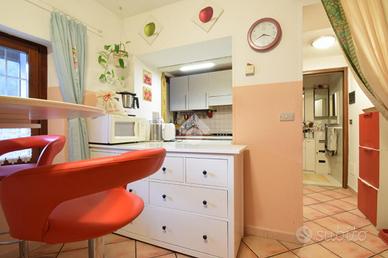 La cucina abitabile è stata arricchita da una penisola che separa l'angolo cottura dal tavolo. Il bagno è finestrato e ospita la lavatrice.