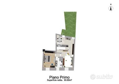La casa è stata progettata per realizzare un'ampia autorimessa con taverna e cantina al piano terreno, un soggiorno con angolo cottura, una camera ed un bagno al piano primo, una camera, una grande stanza con cabina armadio/bagno privato ed un bagno. Un ampio sottotetto è collegato tramite una botola. La proprietà può anche essere suddivisa in due alloggi distinti, ognuno col proprio accesso e la propria area verde.
