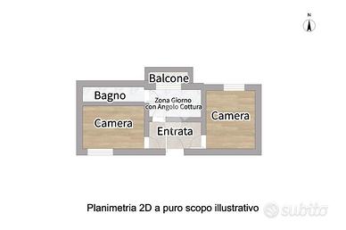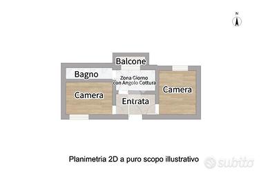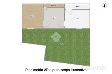 Al piano terra si trova la zona giorno con angolo cottura e affaccio su balcone, un bagno finestrato con box doccia e due camere da letto.
