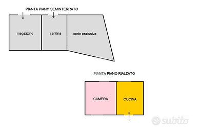 L'abitazione si sviluppa su due livelli, nel seminterrato abbiamo cantina e magazzino mentre al piano terra una zona giorno con angolo cottura ed una camera matrimoniale, ambienti pronti per essere trasformati secondo le proprie esigenze.