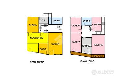 Le unità abitative sono speculari e disposte nello stesso modo, ovvero al piano terra si trovano i soggiorni, con le cucine a vista abitabili. Al piano superiore, abbiamo le camere da letto (due per ogni unità abitativa). I servizi completano le unità. Un terrazzo coperto comune completa il primo piano. Al piano sovrastante, si trova il sottotetto allo stato grezzo, ma eventualmente recuperabile ai fini abitativi, dopo parere comunale favorevole.