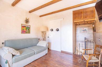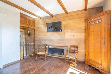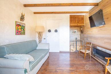 Al piano terra, soggiorno dotato di angolo cottura con travi in legno a vista e camino, ideale per serate di relax;