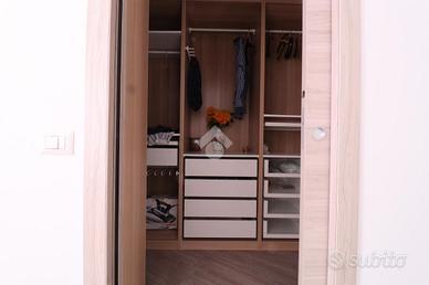 La prima soluzione è composta dalla sala con cucina a vista e dalla cucina al piano terra; il primo piano ospita la camera da letto matrimoniale con cabina armadi e bagno con la vasca idromassaggio; nel piano mansardato troviamo la seconda camera, il ripostiglio ed il bagno con la doccia.