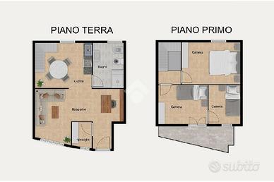 Ad accoglierci alla soluzione al piano primo, troviamo ampia zona giorno, caratterizzata da soggiorno con angolo cottura. A completare il piano un bagno finestrato.