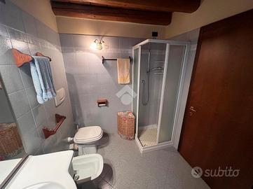 Salendo le scale in legno, al primo piano, troviamo un grazioso bagno finestrato, con doccia e sanitari.