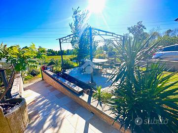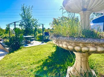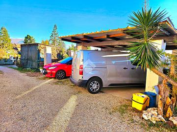 Dal soggiorno si accede all'esterno: a circa tre metri dall'abitazione sono presenti posti auto coperti e il giardino privato. Il giardino, molto curato, dispone di una zona pavimentata con gazebo, ideale per pranzi e cene all'aperto, di un locale adibito a ricovero attrezzi sul quale sono installati ulteriori pannelli solari, di una voliera e di un'ampia area verde. Grazie alla posizione riservata, lo spazio esterno si presta anche alla realizzazione di una piscina.