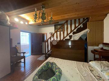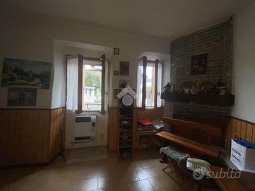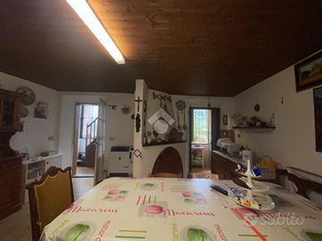 L'abitazione principale ha un accesso da un piccolo sfogo di proprietà, un disimpegno ci dirige in bagno con vasca e finestra e nella zona giorno composta da sala pranzo e angolo cottura e un soggiorno accessoriato di camino a legna. Una cantina comunicante con la zona giorno rifinisce il piano terra.