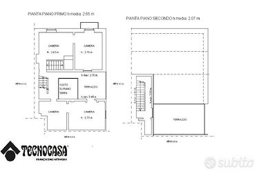 Al primo piano si trovano due camere, oltre a un terrazzo che collega ad altri due locali, offrendo la possibilità di creare un'area giorno luminosa oppure una zona notte ben distribuita.