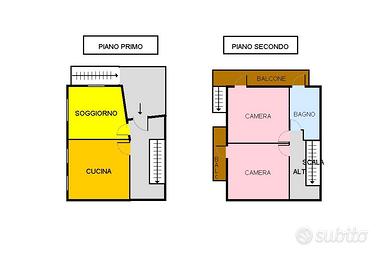 Al piano primo si trovano la cucina e il soggiorno. Al secondo piano sono presenti due camere, un bagno e due balconi.