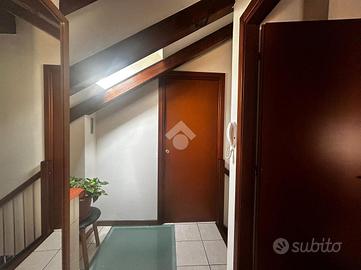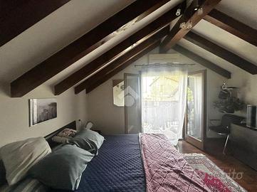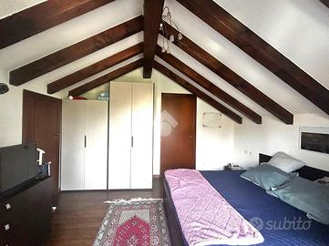 Attraverso una scala interna si accede al piano superiore, dove un disimpegno luminoso introduce alla zona notte dove troviamo una camera matrimoniale con balcone privato e ripostiglio ideale come zona armadi. Una seconda camera e un bagno finestrato dotato di vasca completano la soluzione.