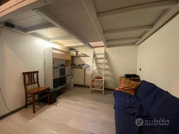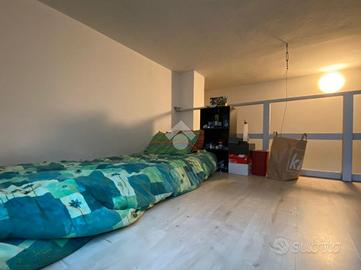 Dalla porta di ingresso si accede direttamente alla zona giorno, caratterizzata da soffitti molto alti, con cucina a vista. Il disimpegno conduce alla zona notte composta dal bagno finestrato con box doccia e dalla camera matrimoniale. Tramite scala interna si accede alla cantina sottostante l'appartamento di circa 35 mq.