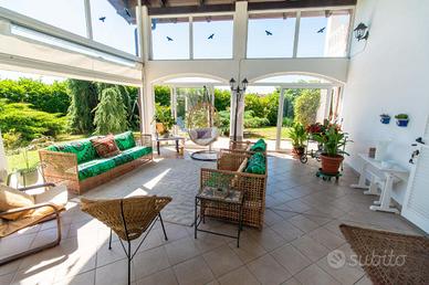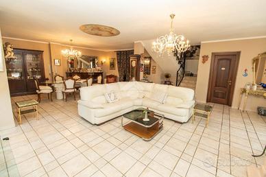 In posizione tranquilla, proponiamo in esclusiva una splendida villa immersa nel verde, situata in strada Pogliani a Leinì. La proprietà si distingue per il suo stile elegante e curato, con ampi spazi esterni perfettamente mantenuti. Il giardino piantumato, con irrigazione automatica, ospita statue ornamentali, vialetti in pietra e una zona relax. L'ampia area verde è ideale per momenti di tranquillità o per accogliere ospiti in un contesto riservato e raffinato. L'immobile, disposto su due livelli, più il piano mansardato, presenta ampie vetrate che donano luminosità agli ambienti interni.