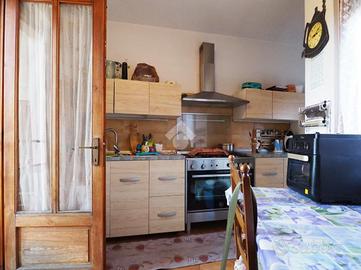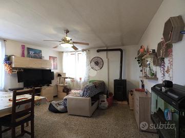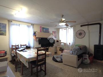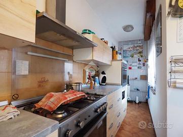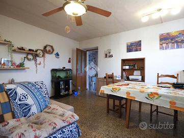 La zona abitativa si sviluppa al primo piano dell'immobile, raggiungibile tramite una scala interna. La zona giorno è caratterizzata da una cucina abitabile con accesso al balcone e un ampio soggiorno con stufa a legna